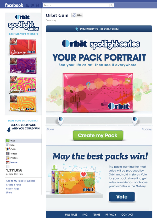 in collaboration with Sebastian DeRossi and EVB... we created a Facebook API application that scrubbed your profile for numbers that were used to create a unique Orbit Gum pack. Participants could submit their design to a gallery and some lucky winners had their artwork produced on actual Orbit Gum packs.
